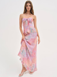 The Teagan pink maxi dress is the bohemian dress you need this summer. Crafted in floral chiffon and featuring a gathered bust and decorative tie detail, this strapless dress spotlights a seductive low-cut back. Style Notes - Fully lined - Invisible zipper at center-back - Scrunchie back strap - Hook and eye closure at the center-back Fabric + Care - Crafted in 100% recycled polyester - Eco dry clean is recommended to avoid harmful chemicals like "perc".