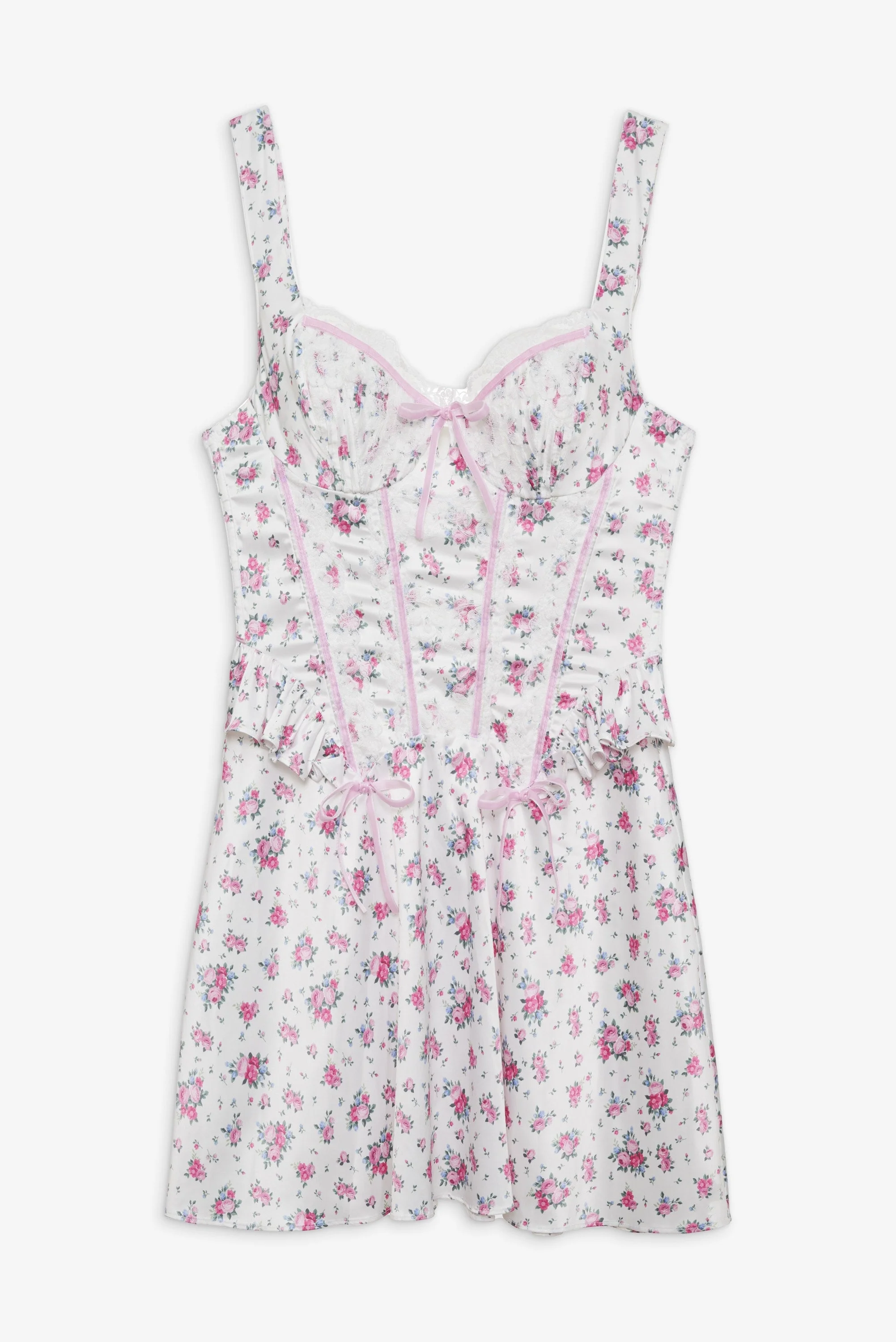 Inspired by vintage kitsch motifs, the That’s Amore slip dress makes for the perfect valentine’s day ensemble. This sweet and feminine white slip dress is crafted in a dainty floral printed satin, spotlighting a bustier style bodice, pin-tucked underwire cups, lace trimmings, and velvet ribbon bow at the center front. Style Notes - Unlined - Hook & eye closure at back - Adjustable tying shoulder straps Fabric + Care - Crafted in 97% polyester, 3% elastane - Lace is made of 100% polyamide - Embroidery is made of 100% polyester - Hand wash cold - Do not wring or twist - Line dry - Do not iron - Do not dry clean