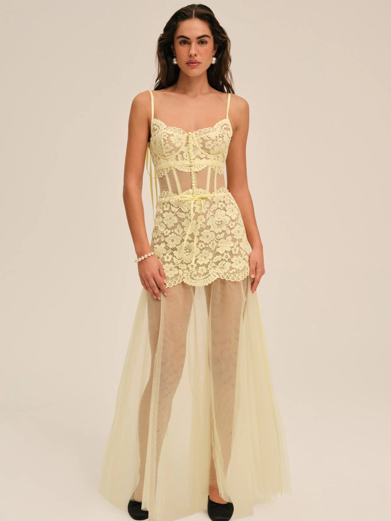 Dress for the Riviera with the Viola lace maxi gown–a butter yellow dress crafted in a classic floral lace and adorned with scallop hems at mini length. This corset dress features a boned sheer mesh bodice, functional dome buttons down center-front, and a sheer tulle maxi skirt for an effortlessly feminine chic look. Fit Notes - True to size Style Notes - Sheer lace cups lined in power-mesh - Invisible zipper - Functional spaghetti shoulder strap ties - Fixed bow at center-front Fabric + Care - Crafted in 64% recycled polyester, 36% polyester - Lining is made of 100% polyester - Dry clean only