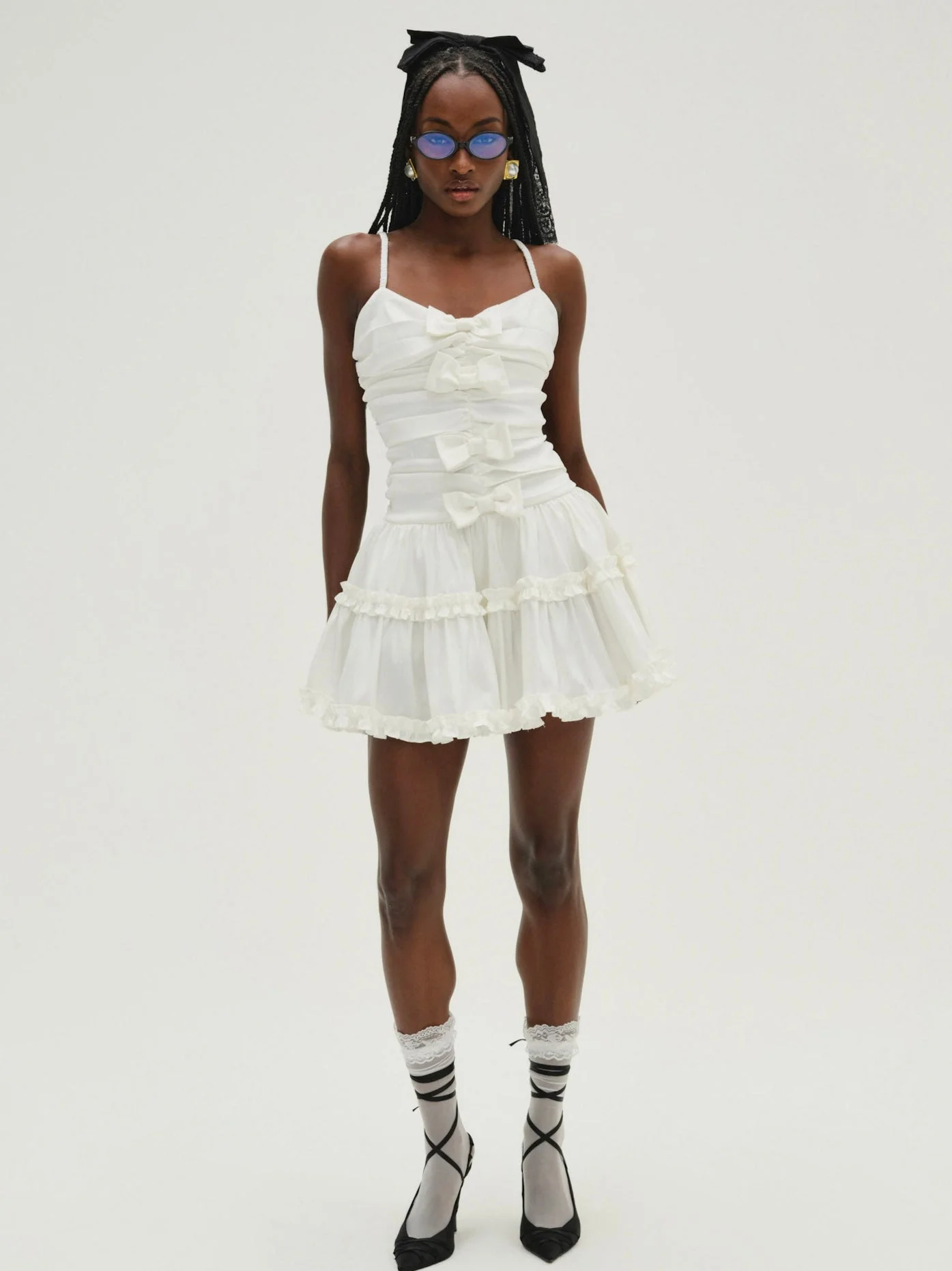 Created for the coquettish Muse, this Whipped Cream white mini dress exudes a sense of romance with its ruched dropped bodice and bows. Featuring a gathered skirt and tiered ruffles, this taffeta dress is perfect for winter balls, New Years Eve parties, and well beyond. Fit Notes - The Whipped Cream Taffeta Mini Dress is fitted through the waist. - We recommend taking your usual size. Style Notes - Tulle skirt lining - Adjustable skinny shoulder straps - Invisible zipper at the center-back Fabric + Care - Crafted in 96% polyester, 4% spandex - Lining1 is made of 98% recycled polyester, 2% spandex - Lining 2 is made of 97% recycled polyester, 3% spandex - Dry clean only