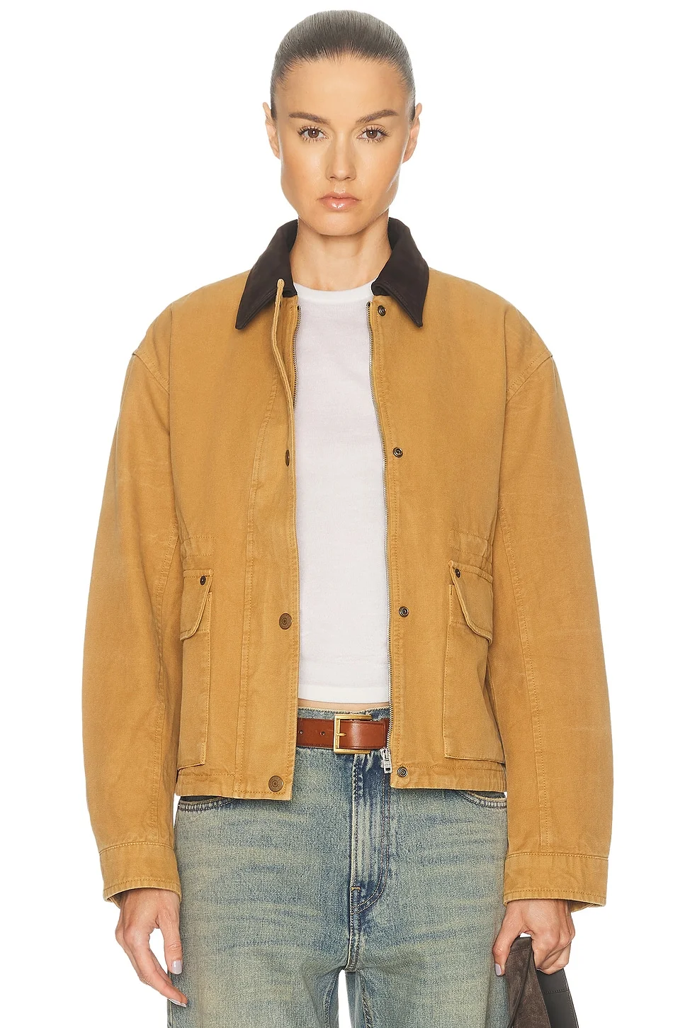Details - Self: 100% cotton - Lining: 100% viscose - Trim: 100% calf leather - Made in Lithuania - Spot clean only - Hidden front zip closure - Snap button down closure - Heavyweight twill fabric - Inner drawcord fastener - Our Style No. ACNE-WO457 - Manufacturer Style No. A90720