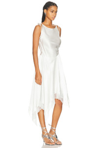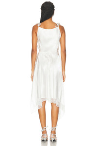 Details - Self 1: 100% acetate - Self 2: 100% nylon - Dry clean - Shoulder tie-up closures - Wrap styling with side tie-up closure - Satin fabric with lace trim and asymmetrical hem - Made in China - Our Style No. ACNE-WD275 - Manufacturer Style No. A20862