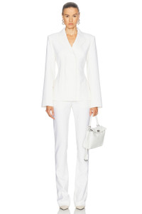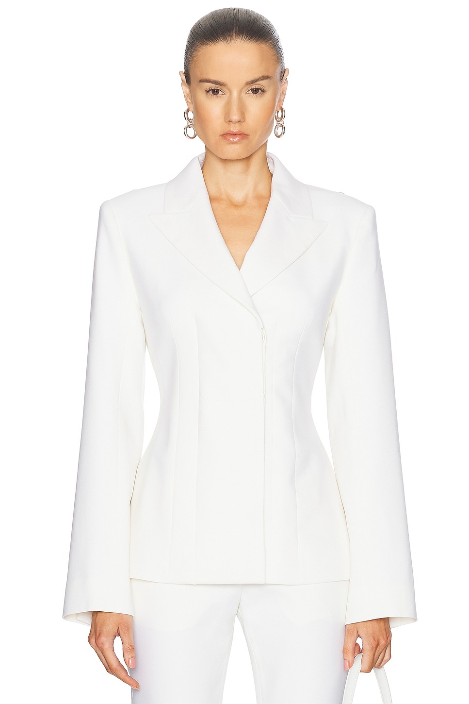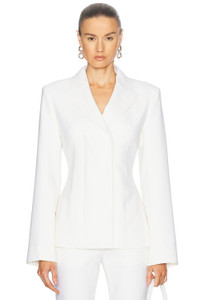Details - Self: 98% wool, 2% elastane - Lining: 64% viscose, 36% polyester - Contrast Fabric: 52% cotton, 43% viscose, 5% elastane - Made in Portugal - Dry clean only - Front button closure - Padded shoulders - Button cuffs - Crepe fabric with satin bra-inspired back - Our Style No. ACNE-WO404 - Manufacturer Style No. AH0299