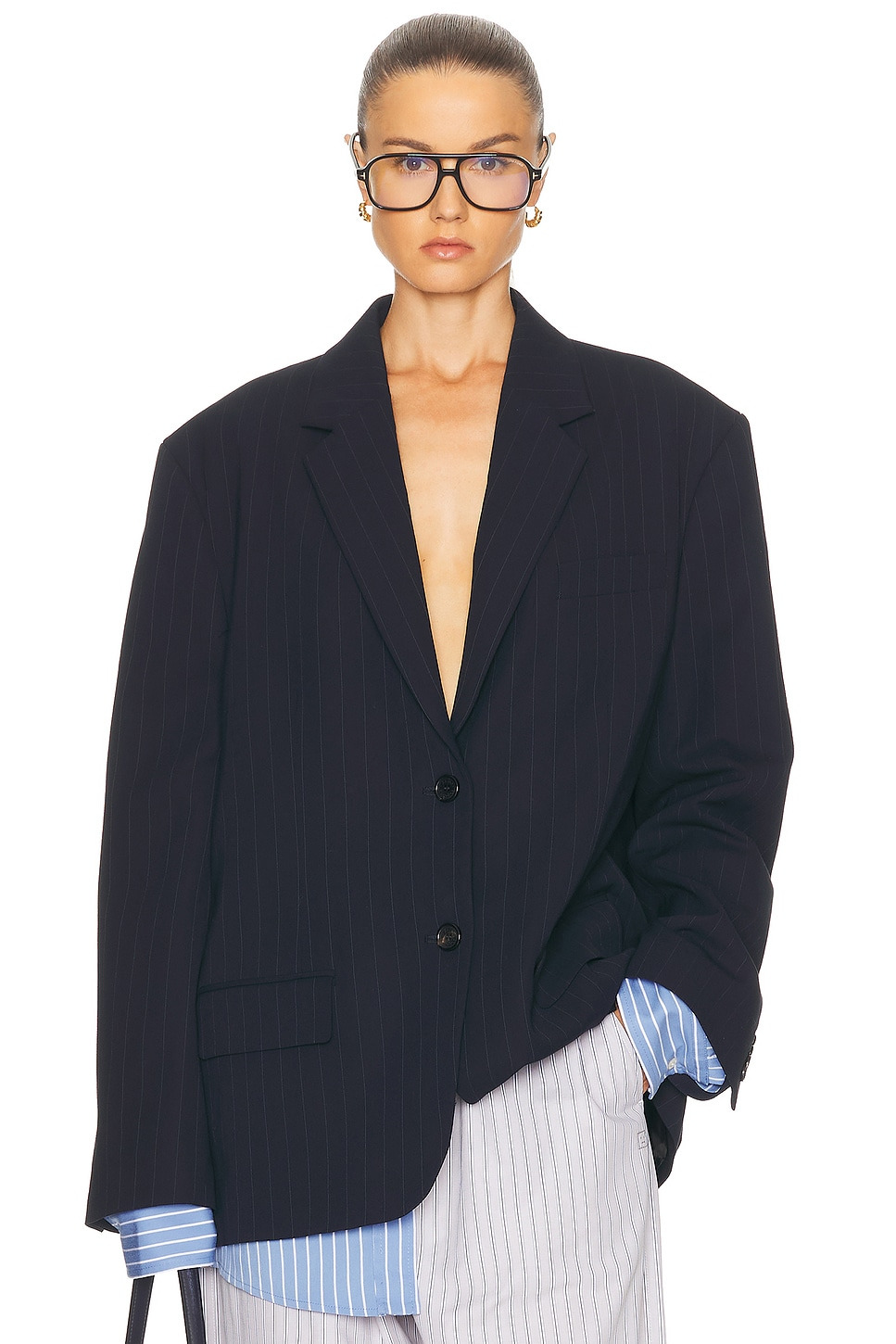 Details - Self 1: 97% viscose, 3% elastane - Self 2: 88% viscose, 11% nylon - Lining: 100% viscose - Dry clean only - Front button closure - Structured padding at shoulders - Breast welt pocket and front lower flat pockets - Layered shirt design - Twill fabric with poplin undershirt - Made in Lithuania - Our Style No. ACNE-WO435 - Manufacturer Style No. AH0309