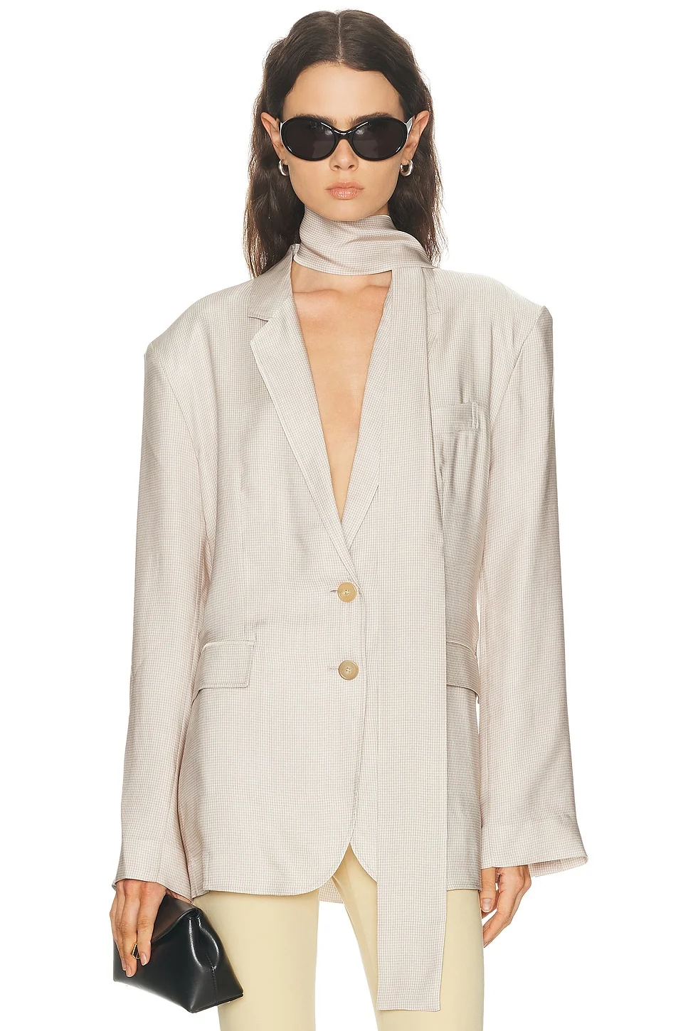 Details - Self & Lining: 100% cupro - Dry clean only - Front button closure - Optional wrap around scarf styling - Front faux flap and breast welt pockets - Padded shoulders - Notched lapel collar - Heavyweight satin fabric - Made in China - Our Style No. ACNE-WO456 - Manufacturer Style No. AH0330