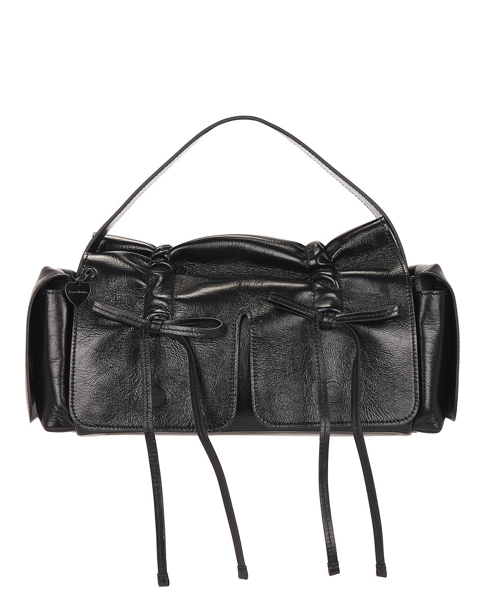 Details - Crinkled patent leather exterior with faux leather lining - Made in Italy - Flaptop with magnetic closure - One main compartment - Two exterior button pockets - Interior slip pocket - Dual bow detail at front - Measures approx 33 cm W x 13 cm H x 11 cm D - Detachable and adjustable shoulder strap with a 45 cm-75 cm drop - Our Style No. ACNE-WY105 - Manufacturer Style No. A10432
