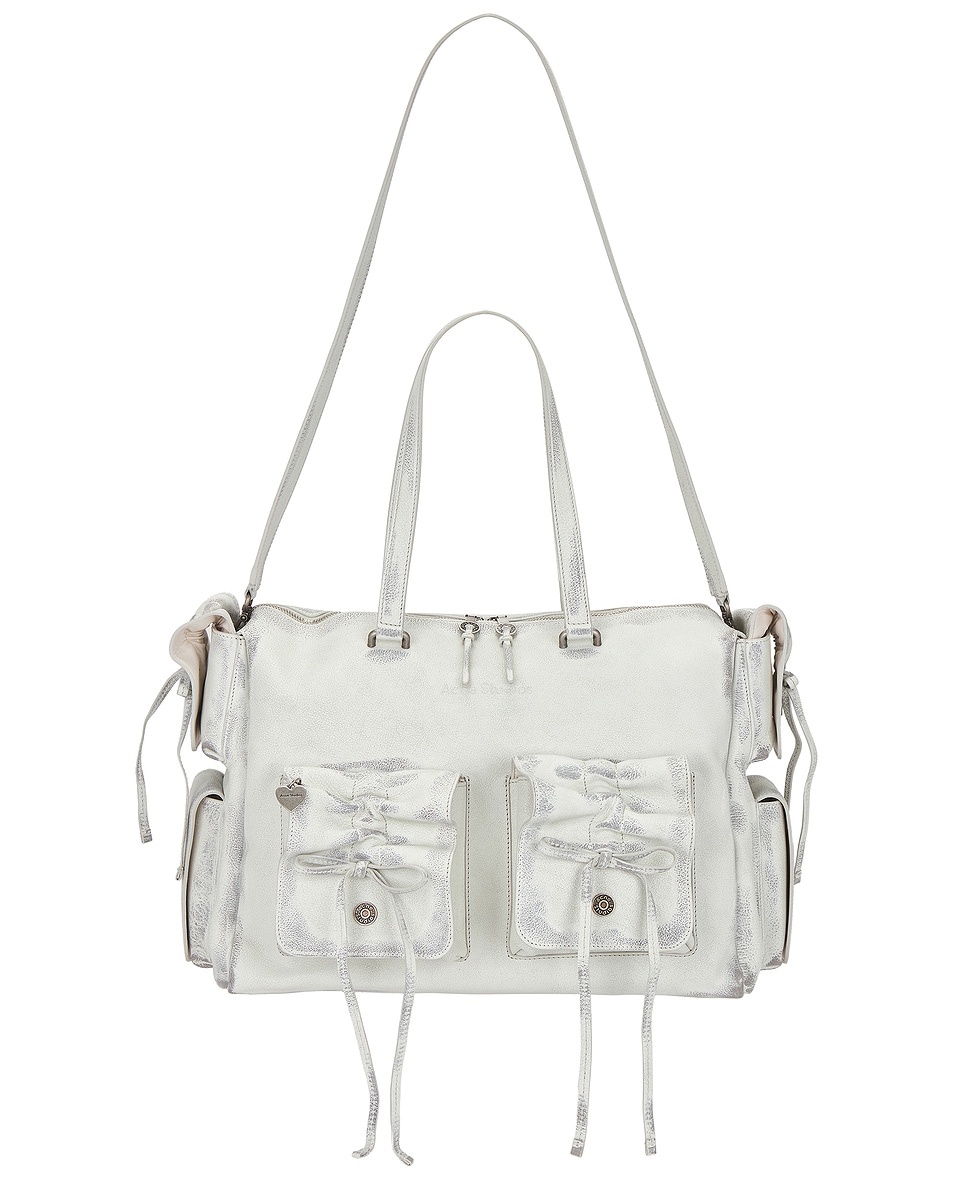 Details - Brushed calf leather exterior with faux leather lining - Made in Italy - Dual top zipper closure - One main compartment - 6 exterior flap button pockets - Interior zipper pocket - Two interior slip pockets - Dual bow detail at front and silver-tone heart charm at flap - Measures approx 39 cm W x 27 cm H x 20 cm D - Detachable and adjustable shoulder strap with a 98 cm drop - Our Style No. ACNE-WY113 - Manufacturer Style No. A10440