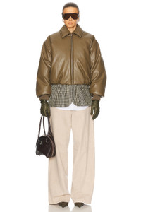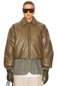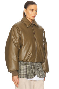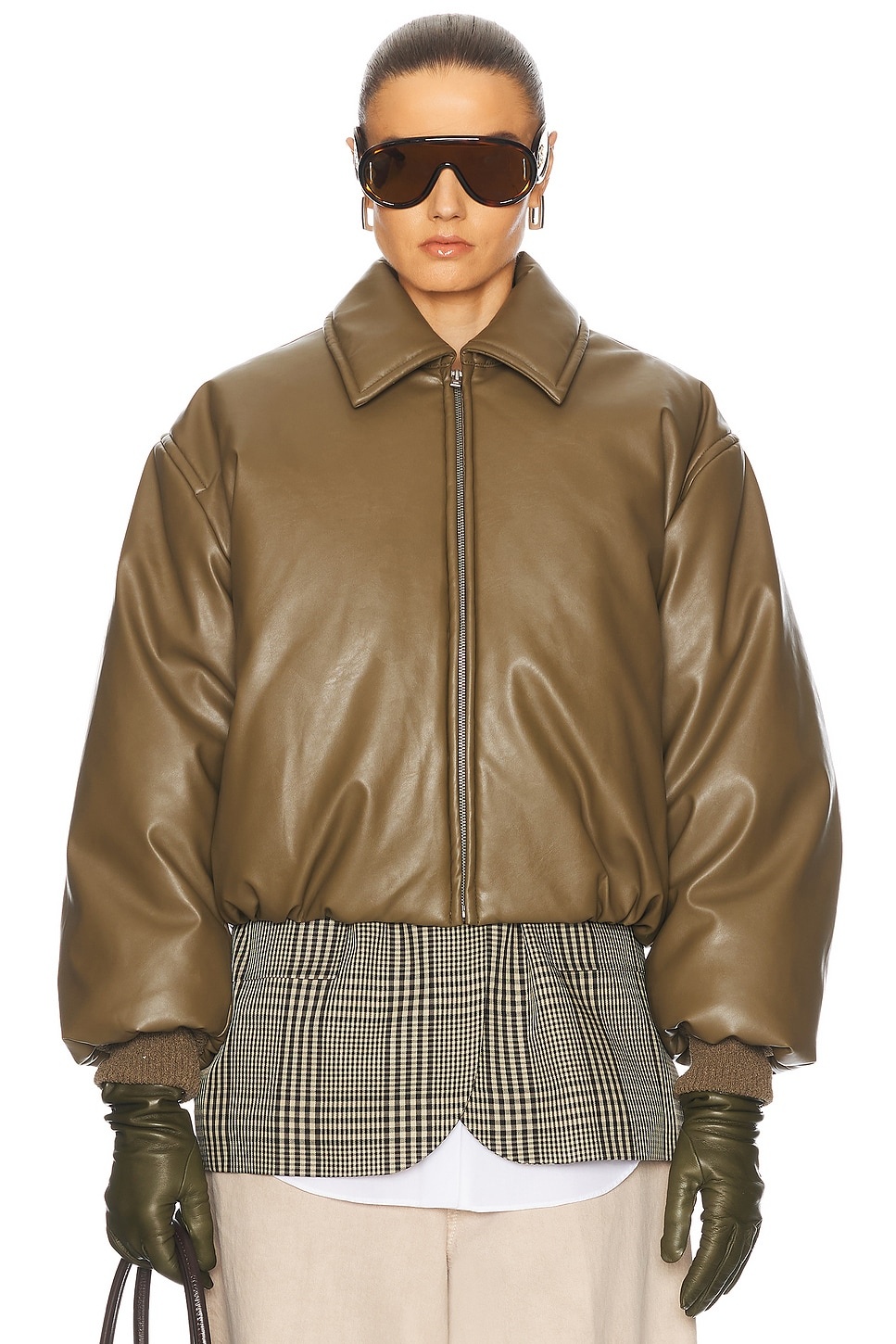 Details - Self 1 & filling: 100% polyester - Self 2: 100% polyurethane - Lining: 100% viscose - Pocket Lining: 100% cotton - Made in China - Spot clean only - Hidden front zipper closure - Side seam pockets - Tonal logo detail at back - Faux leather with knit trim and padding - Our Style No. ACNE-WO421 - Manufacturer Style No. A90570