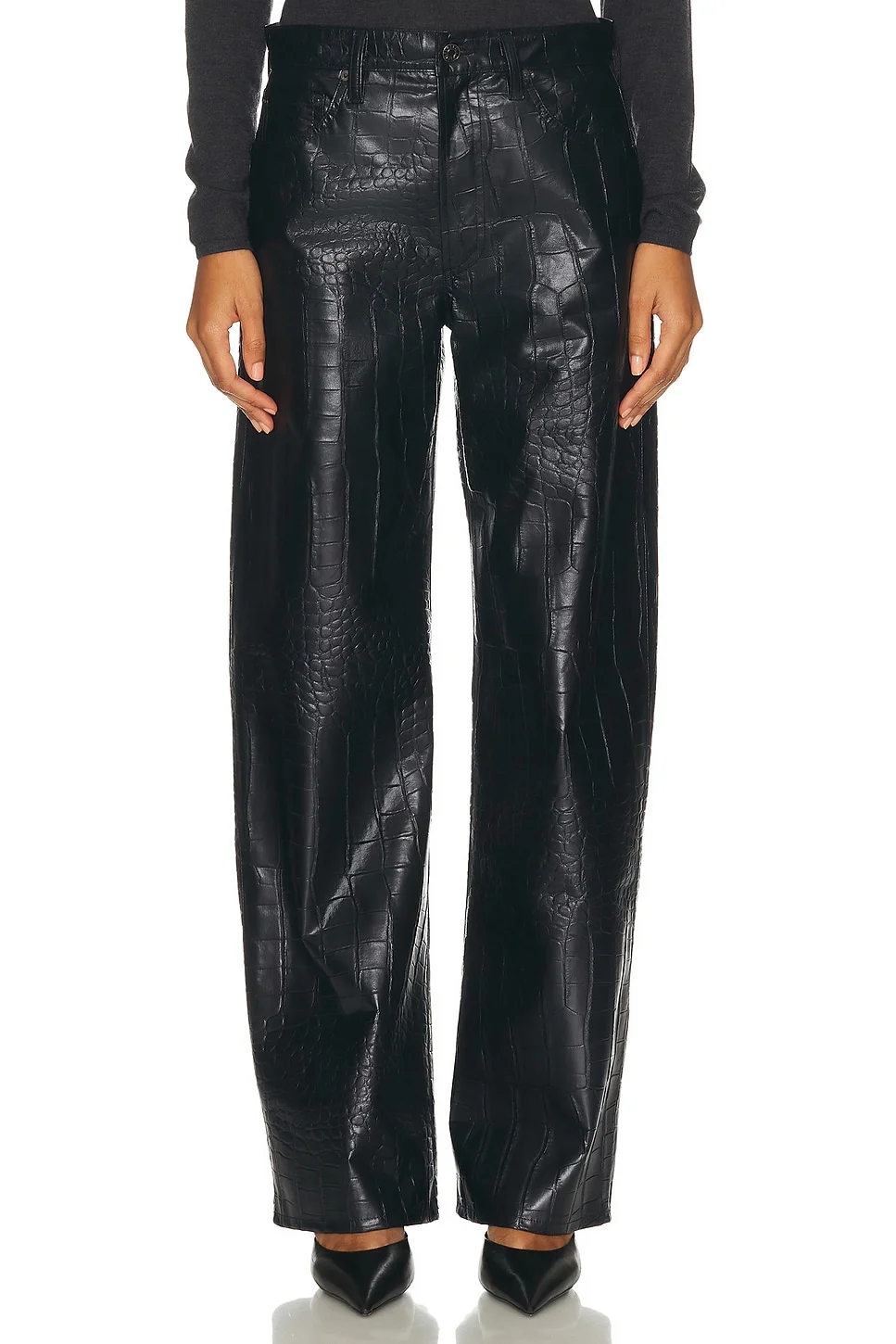 Details - Self: 67% collagen fiber, 19% polyester, 9% polyamide, 5% other fibers - Lining: 95% polyester, 5% elastane - Made in Turkey - Dry clean - Zip-fly with button closure - 5-pocket styling - Faux croc leather textile - Embossed croc inspired design throughout - Our Style No. AGOL-WP80 - Manufacturer Style No. A300-1896