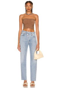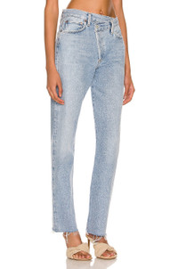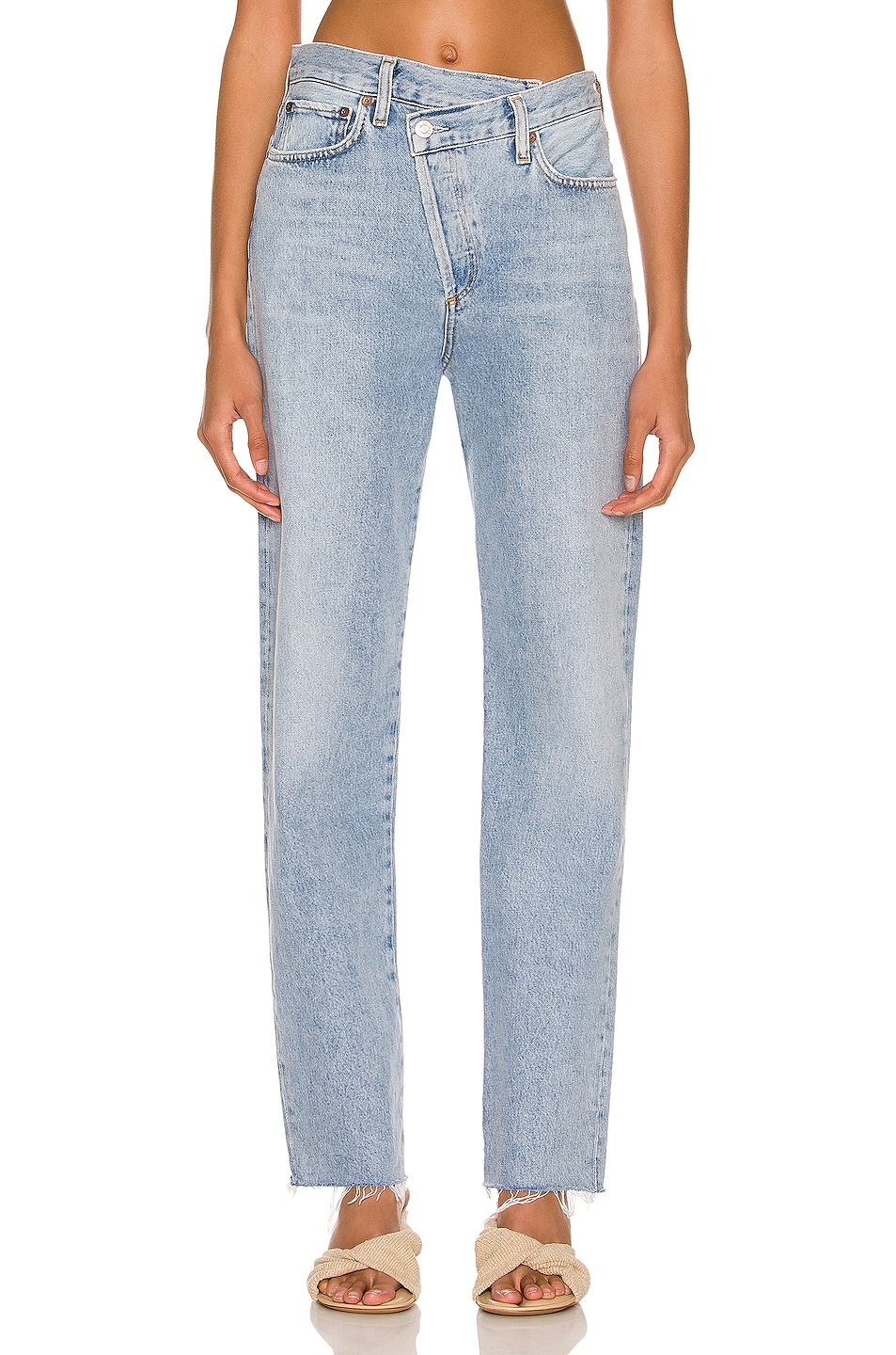 Details - 100% organic cotton - Made in Turkey - Machine wash - Button fly - Asymmetric waistband design with frayed trim - 5-pocket styling with light whiskering detail - Frayed raw-cut hem - Our Style No. AGOL-WJ380 - Manufacturer Style No. A9037-1141