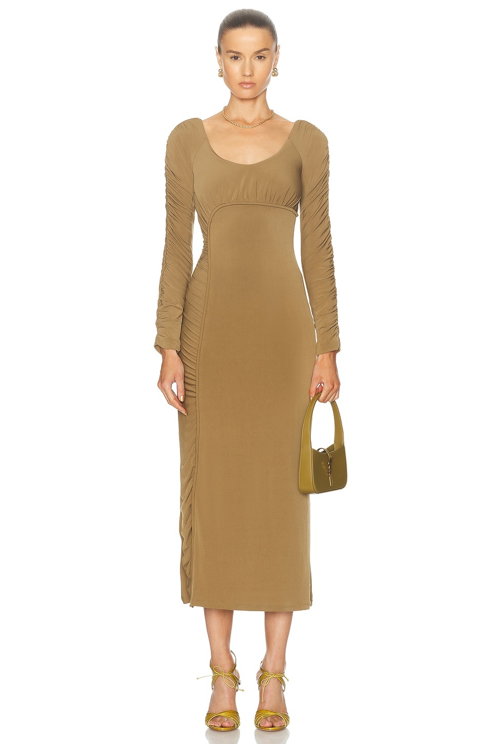 Details - Self: 95% polyester, 5% elastane - Lining: 75% nylon, 25% elastane - Made in China - Hand wash - Fully lined - Pull-on styling - Ruching detail at sleeves and side - Crepe fabric - Our Style No. AJEF-WD99 - Manufacturer Style No. 24AW5161