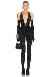 Details - 50% polyester, 40% polyamide, 10% elastane - Made in Australia - Dry clean - Snapbutton gusset closure - Hidden back zipper closure - Plunging neckline design - Mesh textile with velour animal print design - Matching gloves included - Our Style No. APEF-WS114 - Manufacturer Style No. BY062FW25