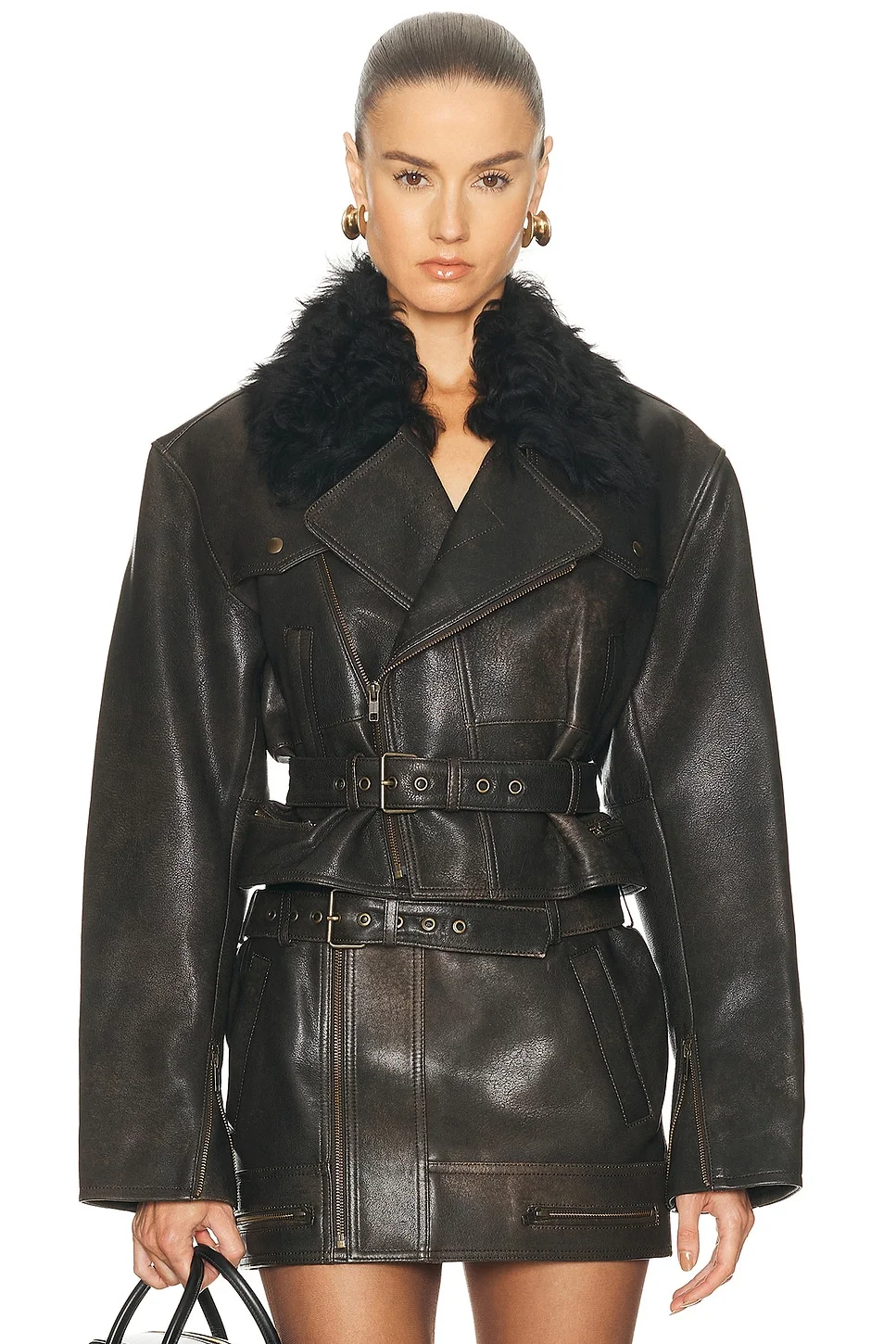 Details - Self: 100% leather - Lining: 100% viscose - Contrast: fur - Made in Turkey - Professional leather clean only - Front zip with waistbelt closure - Heavyweight leather fabric - Gathered waist - Dual slant slip pockets - Our Style No. APEF-WO56 - Manufacturer Style No. J0134FW25