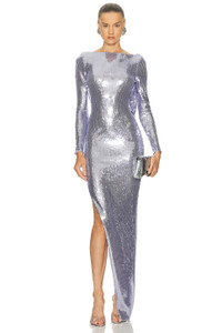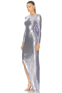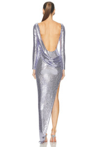 Sequined Mesh Long-Sleeve Draped Backless Asymmetric Gown