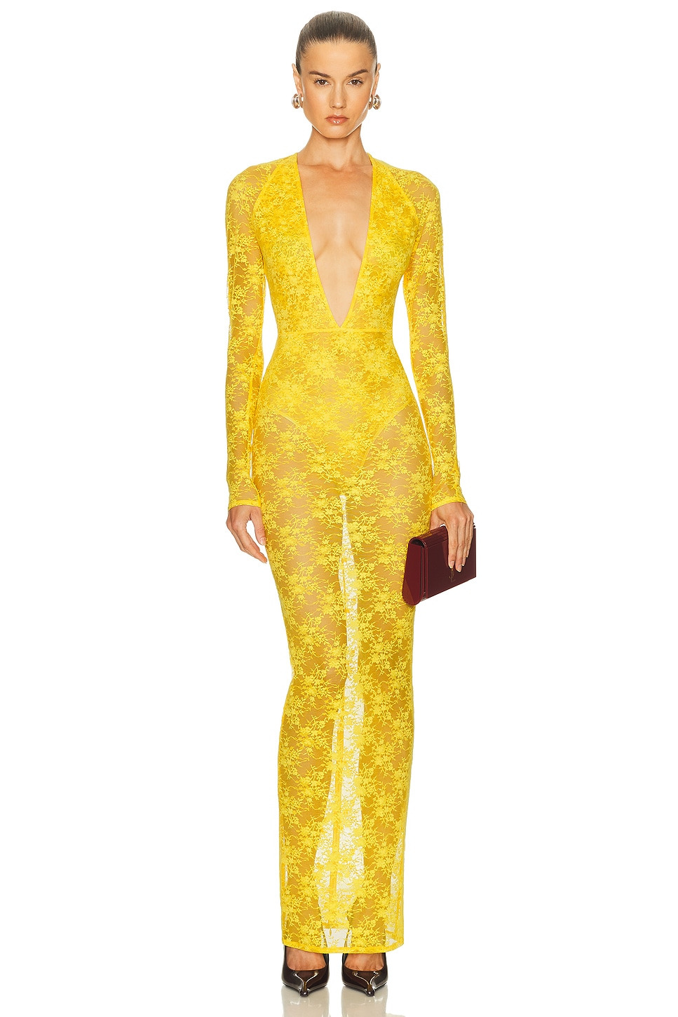 Details - 90% polyamide, 10% elastane - Dry clean only - Partially lined with brief - Hidden back dual zipper closure - Gusset button snap closure - Front plunging neckline - Lace fabric - Garment is intentionally sheer, undergarments will show through - Made in China - Our Style No. APEF-WD248 - Manufacturer Style No. D1515PF25
