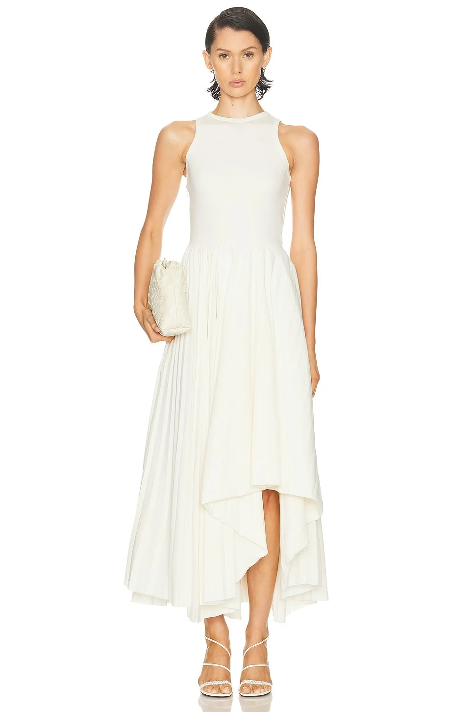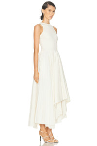 Details - Self: 100% cotton - Self 2: 57% woven paper, 43% viscose - Made in Italy - Dry clean only - Unlined - Hidden side zipper closure - Stretch jersey body - Contrast woven skirt with pleats - Draped pleated skirt - Raw edge hem at skirt - Our Style No. AMCQ-WD233 - Manufacturer Style No. 814517-QLAED-9015