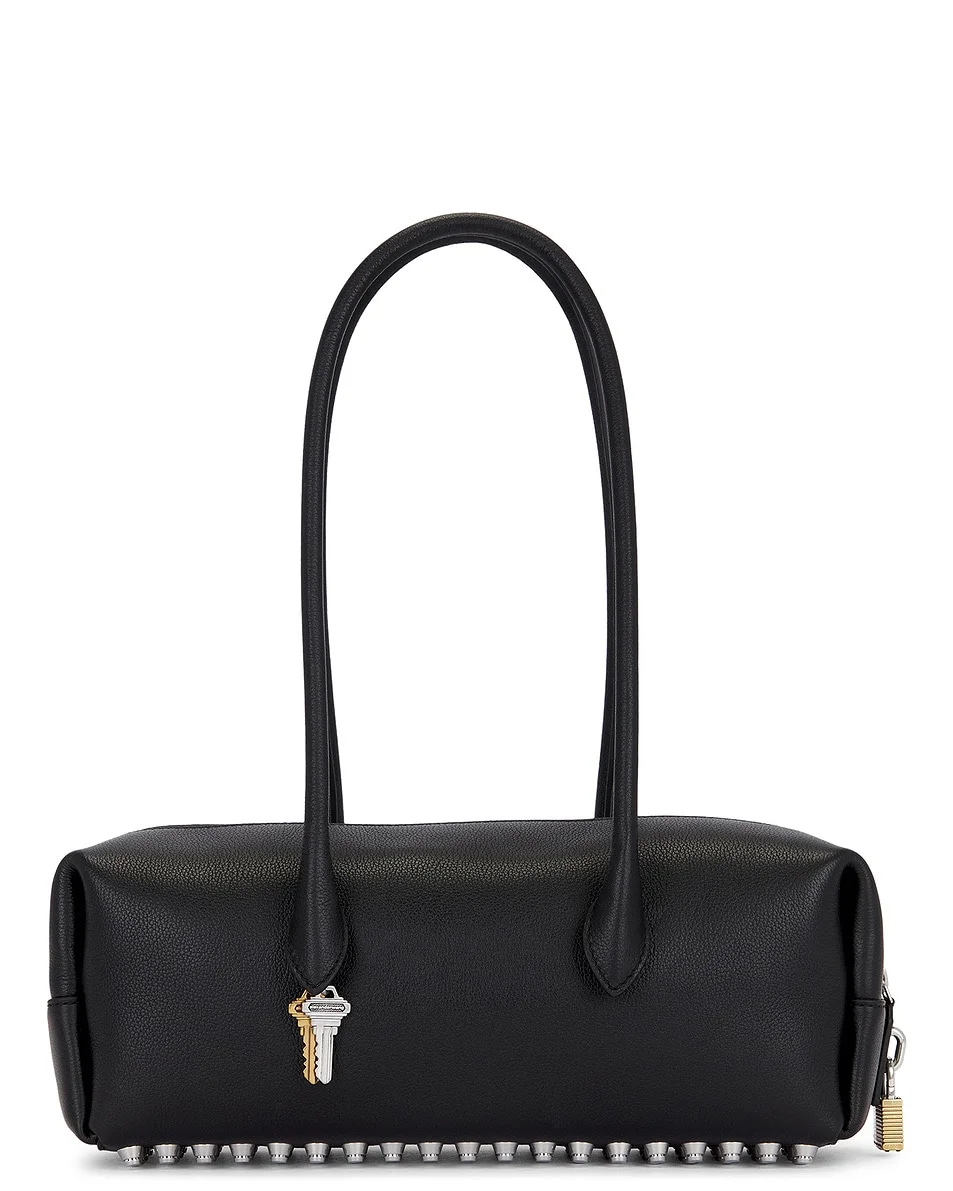 Details - Cow leather exterior with textile lining and silver-tone hardware - Top zip closure - One main compartment - One interior zip pocket - Lightweight metal studs at bottom - Exterior lock and key accents - Measures approx 33 cm W x 10 cm H x 11 cm D - Shoulder strap with a 27 cm drop - Made in Vietnam - Our Style No. AWAN-WY553 - Manufacturer Style No. 20425K14L