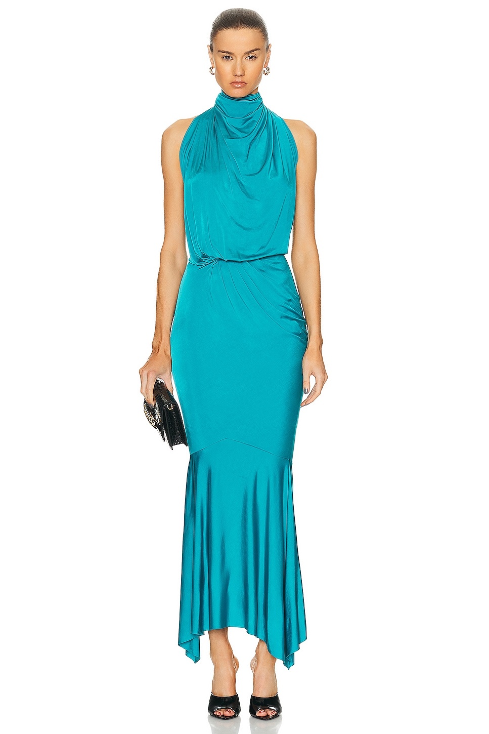 Details - 98% viscose, 2% elastane - Made in France - Dry clean only - Partially lined - Hidden back zipper closure - Halterneck styling with hook and eye closure - Jersey fabric with mermaid hem - Our Style No. ALEF-WD242 - Manufacturer Style No. 241DR2054