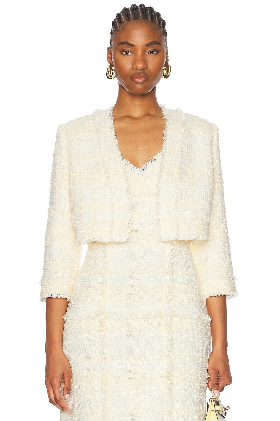 Details - Self: 100% polyester - Lining: 95% polyester, 5% elastane - Made in China - Dry clean only - Pull-on styling - Light padding at shoulders - Cropped fit - Tweed fabric - Item not sold as a set - Our Style No. ALXF-WO36 - Manufacturer Style No. A4250505-0049