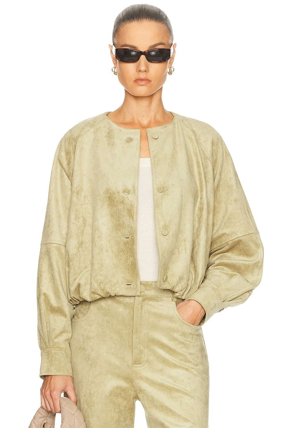Details - Self: 90% polyester, 10% elastane - Lining: 97% polyester, 3% elastane - Dry clean only - Front button closure - Front slant pockets - Cropped fit - Heavyweight faux suede fabric - Item not sold as a set - Made in China - Our Style No. ALXF-WO42 - Manufacturer Style No. A4260503-0963