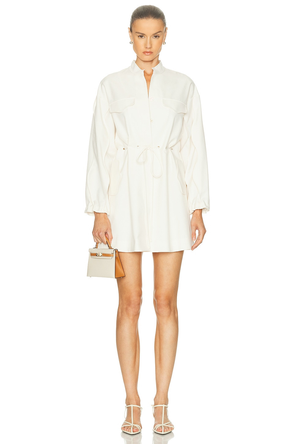 Details - Self: 80% polyester, 20% cotton - Lining: 100% polyester - Dry clean only - Fully lined - Front button closure - Breast flap pockets - Side seam pockets - Adjustable drawstring at waist - Twill fabric - Made in China - Our Style No. ALXF-WD587 - Manufacturer Style No. A2250312-0640