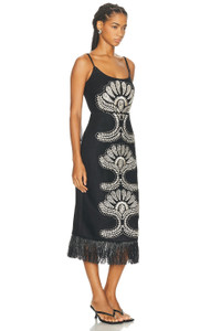 Details - Self: 100% linen - Embroidery: 100% viscose - Lining: 100% polyester - Trim: 100% cotton - Dry clean only - Hidden back zipper closure - Fully lined - Embroidered design - Darting at chest - Faux straw fringe at hem - This item is not available to ship to Australia - Made in India - Our Style No. ALXF-WD601 - Manufacturer Style No. A1250454-0477