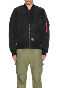 Details - Self: 100% nylon - Cuffs: 100% polyester - Collar & Bottom band: 99% polyester, 1% spandex - Made in China - Dry clean - Front zipper closure - Side slant pockets with snap button closure - Utility pockets at left sleeve with statement logo pull-tab - Nylon webbing oxygen tab on wearers left chest - Puffed ripstop fabric with ribbed trim and interior slip pocket - Our Style No. ALPF-MO107 - Manufacturer Style No. MJM53504C1