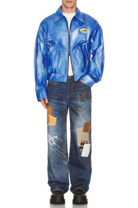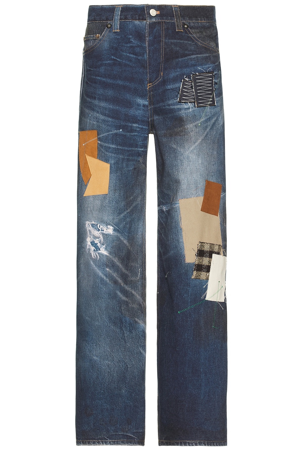 Details - Self 1: 100% cotton - Self 2: 100% polyurethane - Self 3: 70% cotton, 30% polyester - Self 4: 42% wool, 22% mohair, 18% nylon, 18% alpaca - Self 5: 59% cotton, 32% wool, 9% nylon - Made in Korea - Dry clean only - Zip fly with button closure - 5-pocket styling - Leather patch with grommet detail at back waist - Rigid denim fabric with patchwork design - Our Style No. ANBF-MJ6 - Manufacturer Style No. apa789u