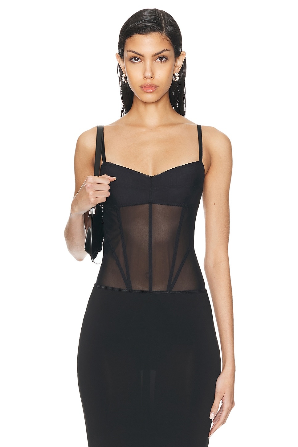 Details - 93% nylon, 7% elastane - Made in Ukraine - Dry clean only - Pull-on styling with back hook and eye closure - Adjustable shoulder straps - Gusset design bodysuit - Garment is intentionally sheer, undergarments will show through - Our Style No. AOCT-WS30 - Manufacturer Style No. SS2427