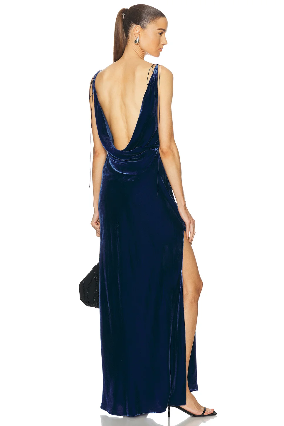 Details - 80% viscose, 20% silk - Made in Ukraine - Dry clean only - Partially lined - Shoulder strap tie-up closures - Draped fabric at back neckline - Velvet fabric with side slit - Our Style No. AOCT-WD76 - Manufacturer Style No. PS2501