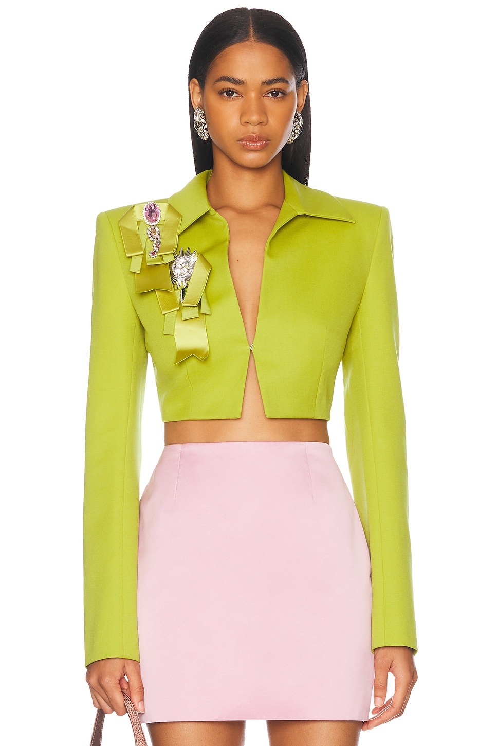 Details - Self: 100% virgin wool - Lining: 100% viscose - Made in Italy - Dry clean only - Singular front hook and eye closure - Structured padding at shoulders - Rhinestone pin accents at front - Cropped fit - Twill fabric - Our Style No. ARFE-WO39 - Manufacturer Style No. SS25AWTA0029FA01