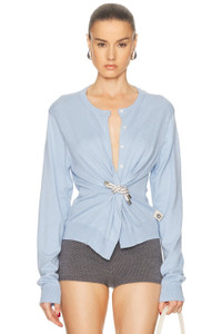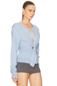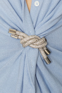 Details - 95% cotton, 5% cashmere - Made in China - Dry clean only - Front button down closure - Twisted knot at front with silver-tone rhinestone hardware - Lightweight fine knit textile - Our Style No. ARFE-WK32 - Manufacturer Style No. RS26AWKN0031YA01