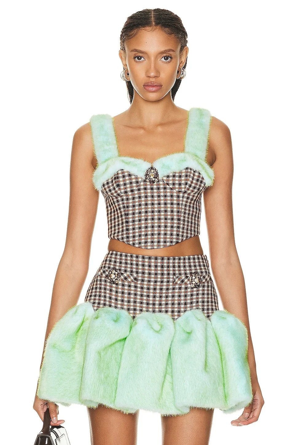 Details - Self: 74% virgin wool, 26% cotton - Combo: 100% polyester - Lining: 100% viscose - Made in China - Professional dry clean only - Exposed back zipper closure - Lightly padded underwire cups - Adjustable shoulder straps - Faux fur trims - Crystal embellished button accent at front - Item not sold as a set - Our Style No. ARFE-WS130 - Manufacturer Style No. 2304T12B234