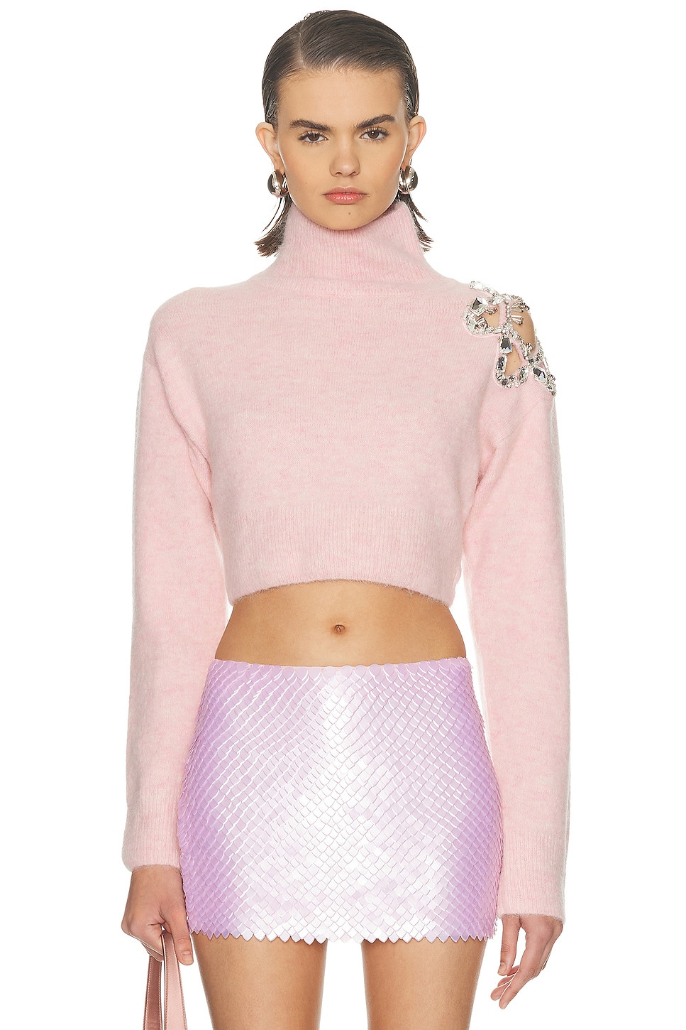 Details - 27% nylon, 25% wool, 25% alpaca, 20% viscose, 3% elastane - Dry clean only - Pull-on styling - Turtleneck design - Rhinestone detail with cut-out design at left shoulder - Cropped fit - Midweight knit fabric - Made in China - Our Style No. ARFE-WK30 - Manufacturer Style No. FW25AWKN0025YA01