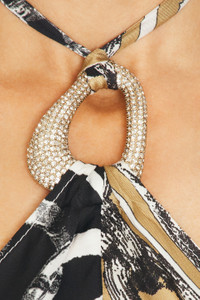 Details - Self 1: viscose - Self 2: 80% zinc casting, 20% glass - Made in Italy - Dry clean only - Halterneck and back tie-up closures - Rhinestone embellished hardware at front - Open back - Crepe fabric - Our Style No. ARFE-WS175 - Manufacturer Style No. RS25AWTP0061FA01