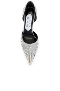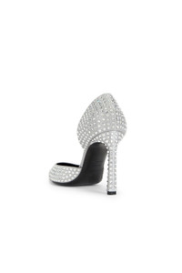 Details - Crystal embellished satin upper with leather sole - Made in Italy - Slip-on styling - Leather footbed with leather and textile lining - Pointed toe with silver-tone metal hardware and stiletto heel - Approx 95mm/ 3.75 inch heel - Our Style No. ARFE-WZ20 - Manufacturer Style No. B06070-MAFT72-1420-110