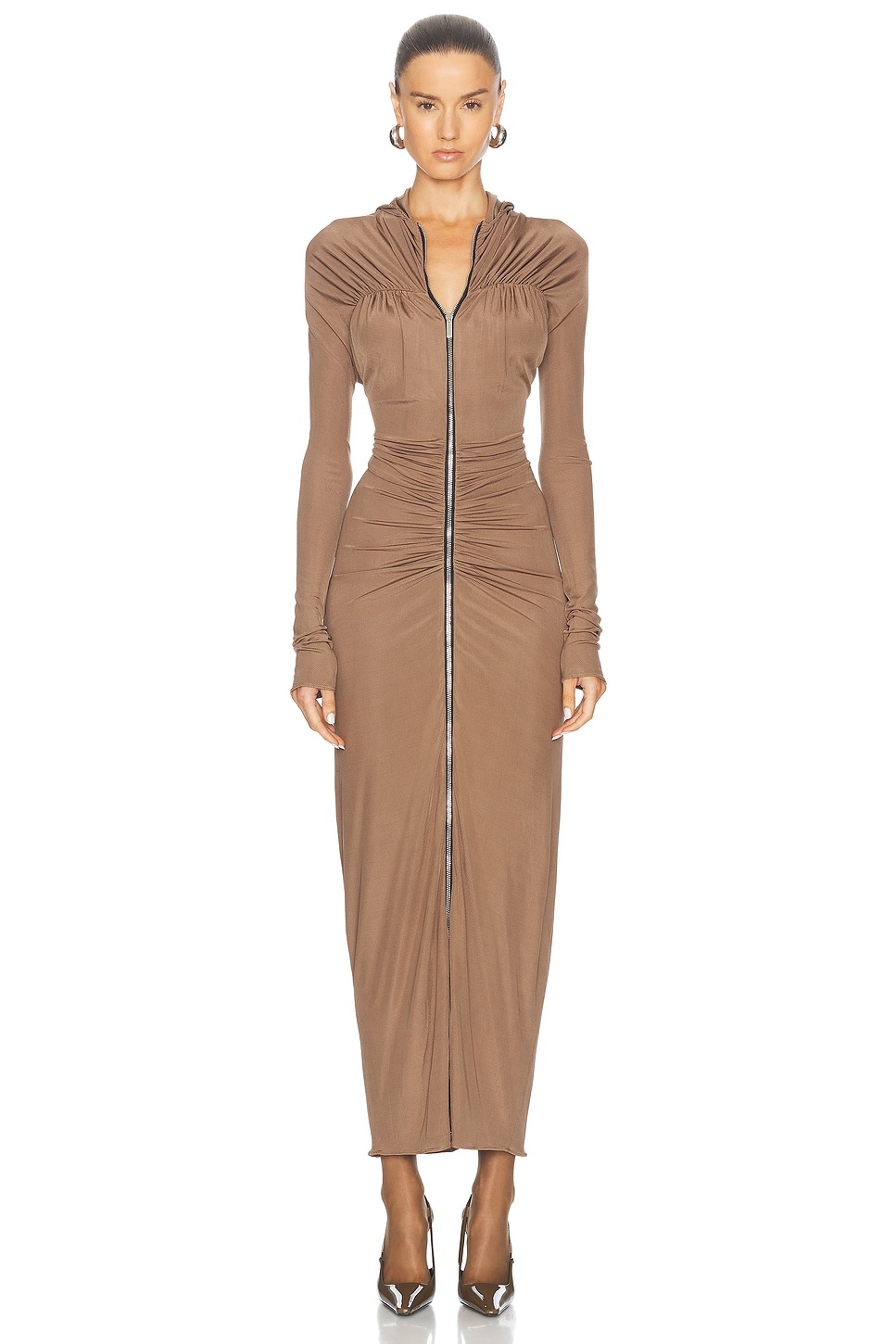 Details - 95% viscose, 5% elastane - Made in France - Dry clean only - Unlined - Exposed front zipper closure - Hoodie design - Ruching front and back - Jersey fabric - Our Style No. ATLF-WD30 - Manufacturer Style No. R22B