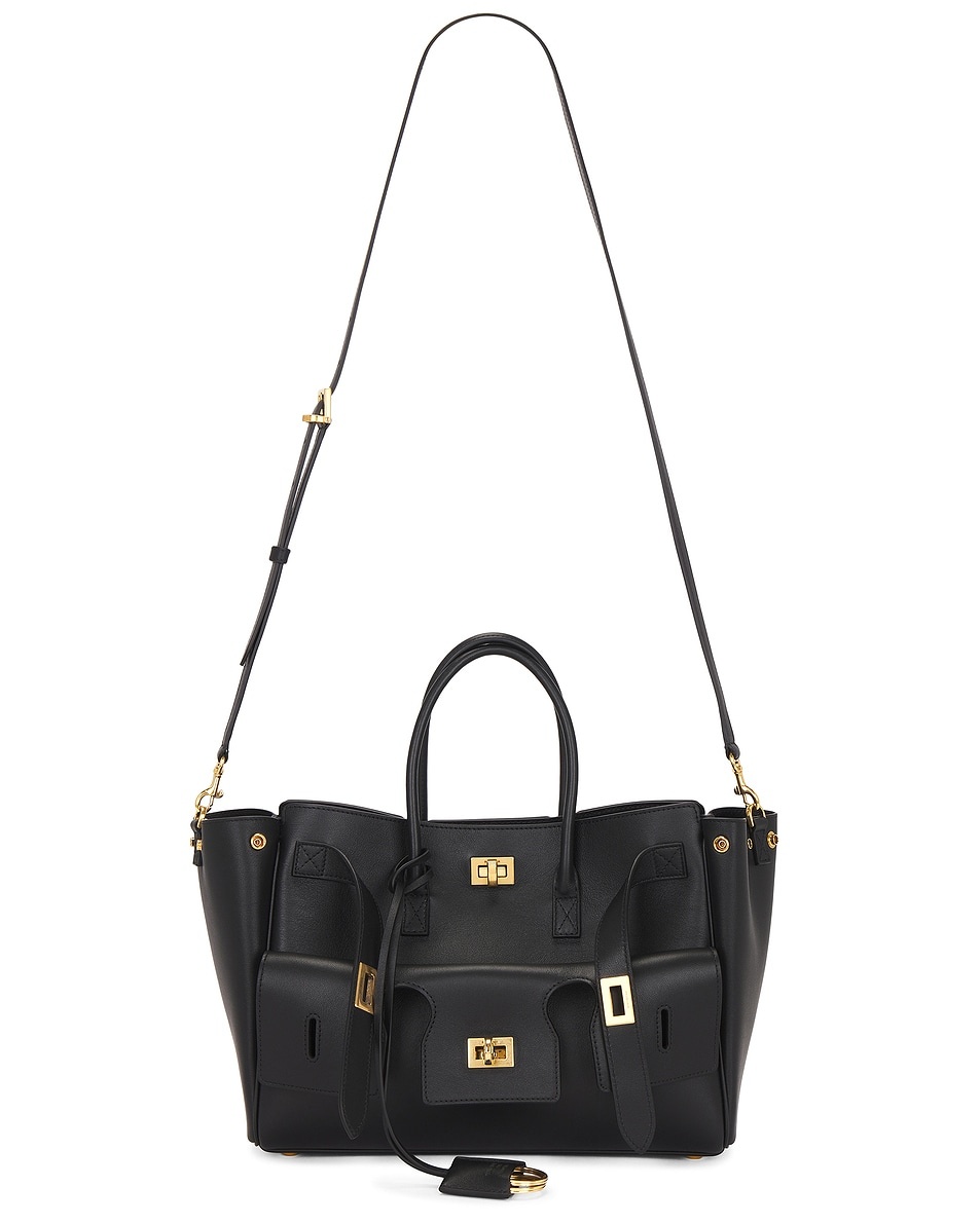 Details - Calfskin leather exterior and lining - Made in Italy - Top gold-tone turnlock closure - One main compartment - Dual interior zippered pockets and dual slip pockets - Removable cloche cles with two split rings - Front slip pocket with gold-tone turnlock detail - Detachable and adjustable leather shoulder strap - Measures approx 30 cm W x 20 cm H x 12 cm D - Shoulder strap with a 52 cm drop - Top handle with a 17 cm drop - Our Style No. BALF-WY1555 - Manufacturer Style No. 8356892-ABAV