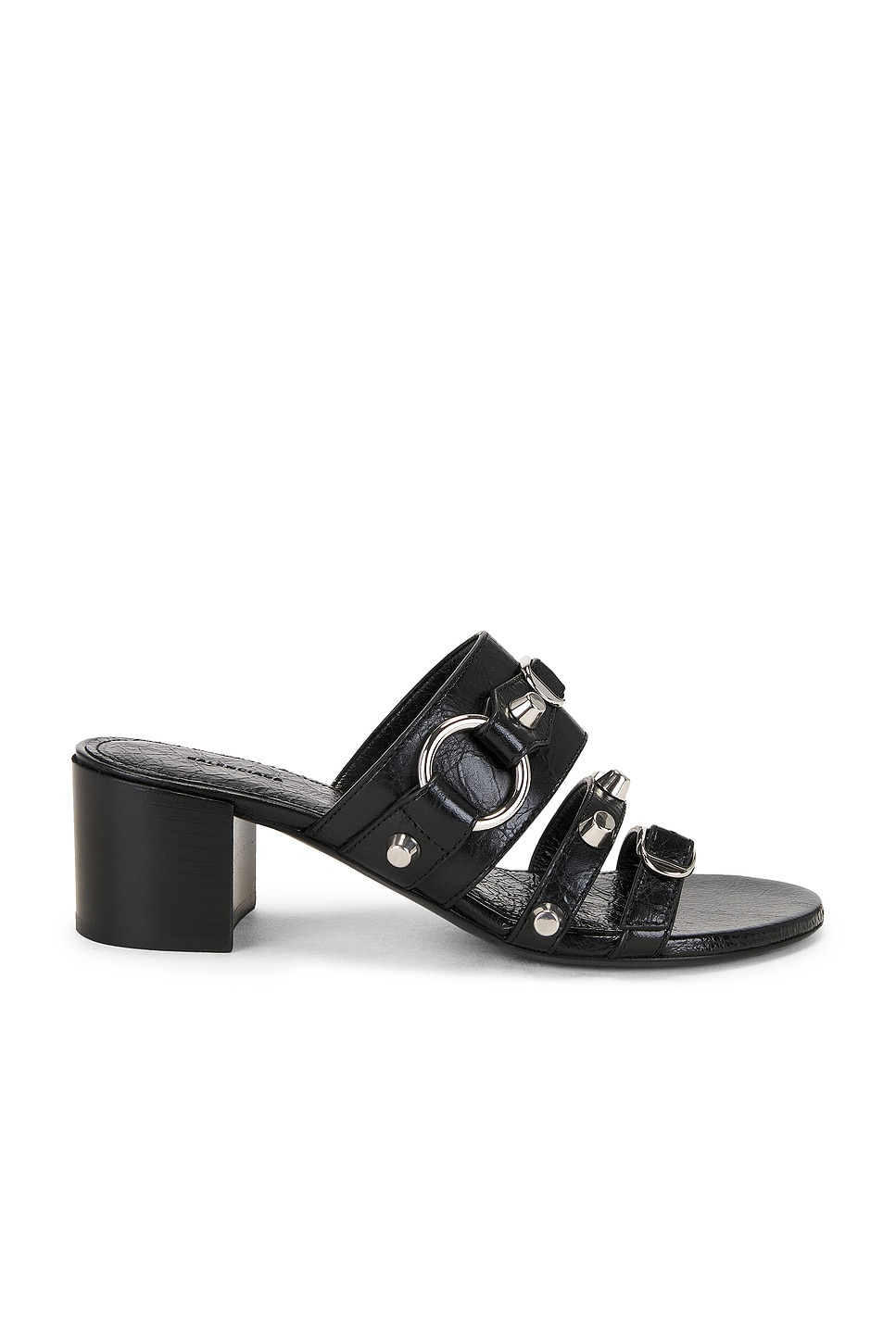 Details - Arena lambskin leather upper; leather lining & leather sole - Triple strap slip on style with buckle & stud hardware - Leather footbed & leather lining - Bold silver-tone hardware (studs, buckles) contrasts with black lambskin for a luxe rocker-chic aesthetic - Three strap vamp gives a visually striking design while maintaining wearability - Flat/slight heel profile great for comfort + statement look; versatile enough for casual or more dressed up outfits - Made in Italy - Our Style No. BALF-WZ824 - Manufacturer Style No. 840085-WAD4Y-1080