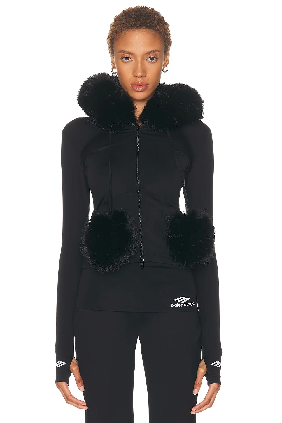 Details - Self 1: 86% polyamide, 14% elastane - Self 2: 100% polyester - Made in Portugal - Dry clean - Front zipper closure - Slant pocket styling - Stretch jersey textile with faux fur trims - Faux fur lined hoodie with logo embroidery - Item not sold as a set - Our Style No. BALF-WO169 - Manufacturer Style No. 855647-TTVK3-8190