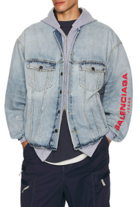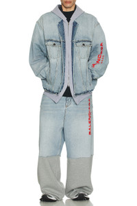 Details - Self: 100% cotton - Lining: 65% polyester, 35% cotton - Machine wash - Hidden two way front zip closure with button overlay - 4-pocket styling - Embroidered logo at sleeves - Attached hoodie - Midweight denim with patchwork hoodie underlayer - Made in Italy - Our Style No. BALF-MO117 - Manufacturer Style No. 824304TSW824200