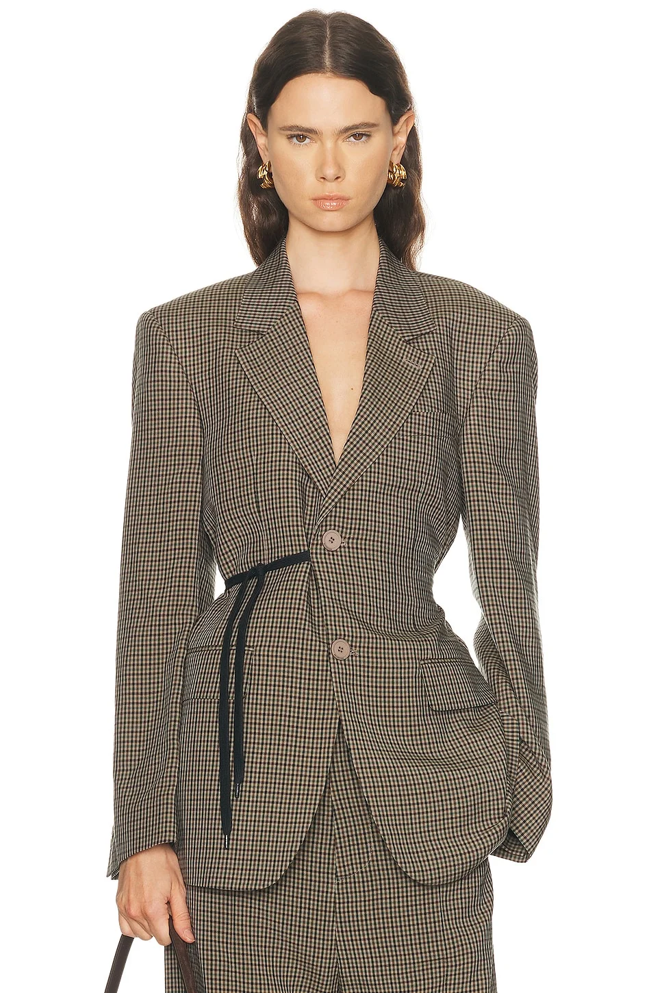 Details - Self: 100% lyocell - Lining: 100% cupro - Contrast Fabric: 100% cotton - Dry clean only - Front button closure - Front faux flap pockets and breast welt pocket - Wrap around design with tie closure - Padded shoulders and notched lapel collar - Heavyweight suit fabric - Item not sold as a set - Made in Italy - Our Style No. BALF-WO173 - Manufacturer Style No. 857365-TTO38-2866