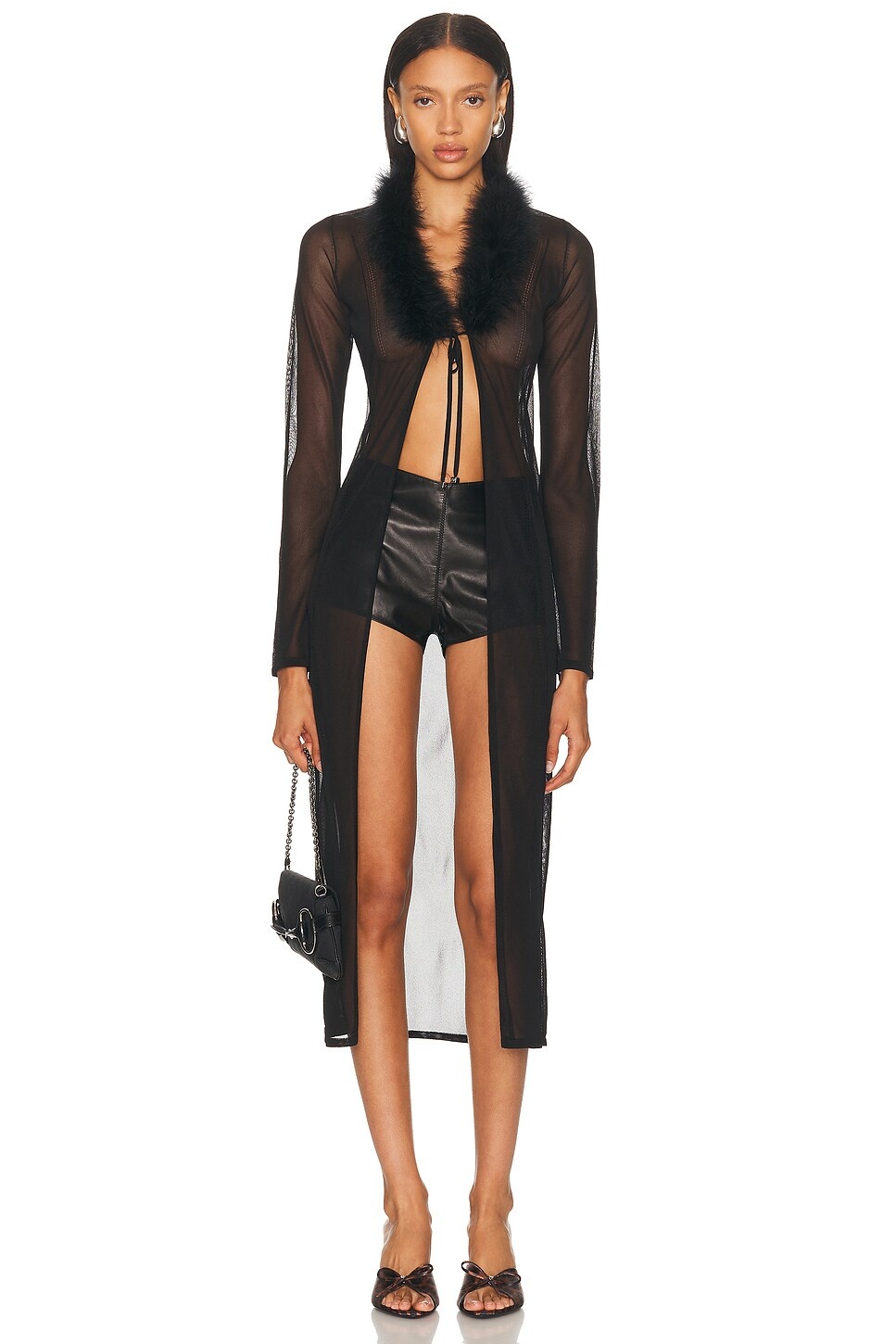 Details - 76% viscose, 24% polyamide - Dry clean only - Front tie-up closure - Mesh fabric with feather detail at collar - Garment is intentionally sheer, undergarments will show through - Made in China - Our Style No. BMAF-WK35 - Manufacturer Style No. P522M578A