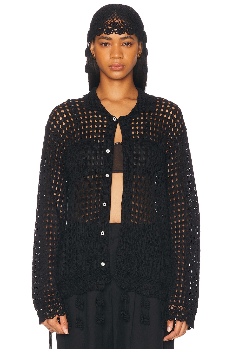 Details - 100% pima cotton - Made in Peru - Dry clean only - Front button loop closure - Open crochet fabric - Garment is intentionally sheer, undergarments will show through. - Please note undergarment not included - Our Style No. BOFE-WS100 - Manufacturer Style No. MRS25KT054