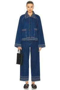 Details - 100% cotton - Made in India - Dry clean only - Zip fly with button closure - 4-pocket styling - Front pintuck detail - Structured denim fabric with embroidery at waist and cuffs - Item not sold as a set - Our Style No. BOFE-WJ1 - Manufacturer Style No. WRS24BT013