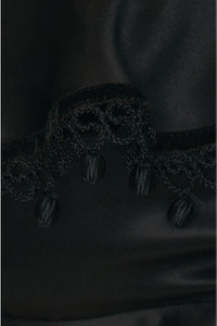 Details - 55% viscose, 45% silk - Made in USA - Dry clean only - Back strap with buckle closure - Front drawstring ruching - Satin fabric with ruffle overlay and beaded lace hem - Our Style No. BOFE-WS30 - Manufacturer Style No. WRF23UP007