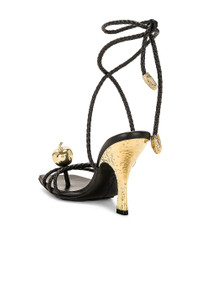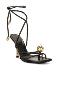 Details - Leather upper with leather and rubber sole - Made in Italy - Braided ankle wrap tie closure with gold-tone hardware at ends - Leather footbed and lining - Toe divider with gold-tone apple - Strappy styling - Slanted square toe with gold-tone spool heel - Approx 100mm/ 4 inch heel - Our Style No. BOTT-WZ501 - Manufacturer Style No. 763795-VBSDE-1000