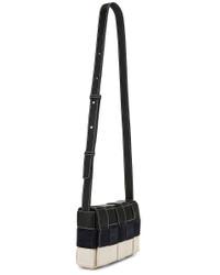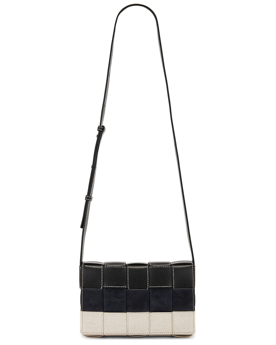 Details - Unlined intreccio leather, suede, and canvas - Made in Italy - Flaptop with magnetic closure - One main compartment with single zip pocket - Interior zipper pocket - Adjustable shoulder strap - Measures approx 23 cm W x 15 cm H x 5 cm D - Adjustable shoulder strap with a 52 cm drop - Our Style No. BOTT-MY245 - Manufacturer Style No. 758105-V56Q2-9227