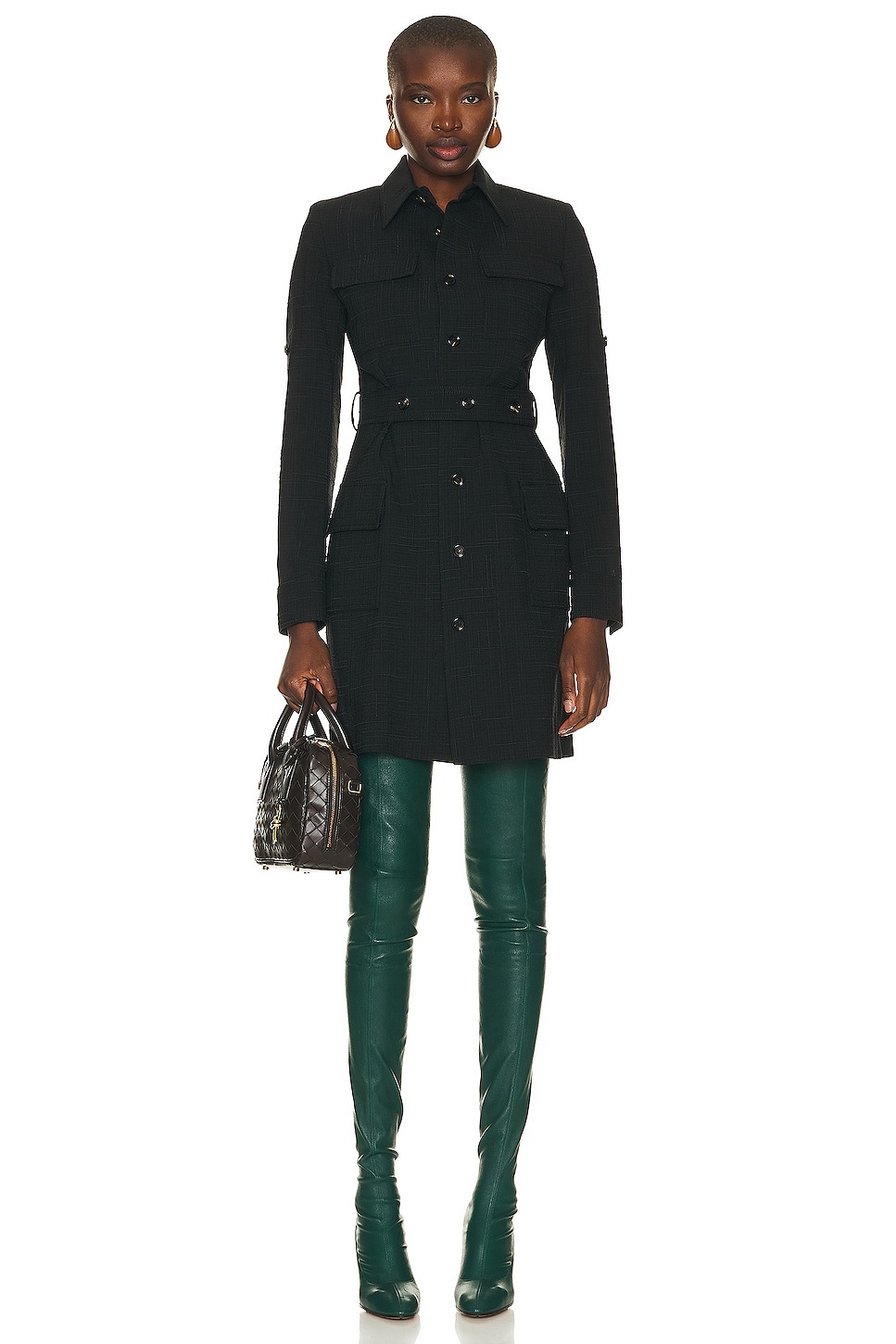 Details - Self: 41% viscose, 35% silk, 24% polyester - Contrast Fabric: 100% viscose - Made in Italy - Dry clean only - Unlined - Front button closure - Removable waist belt - Buttoned cuffs - Midweight tweed fabric - Our Style No. BOTT-WD82 - Manufacturer Style No. 771701-V3PN0-1000