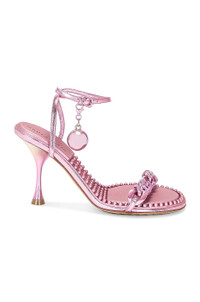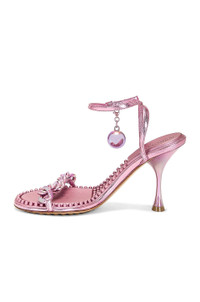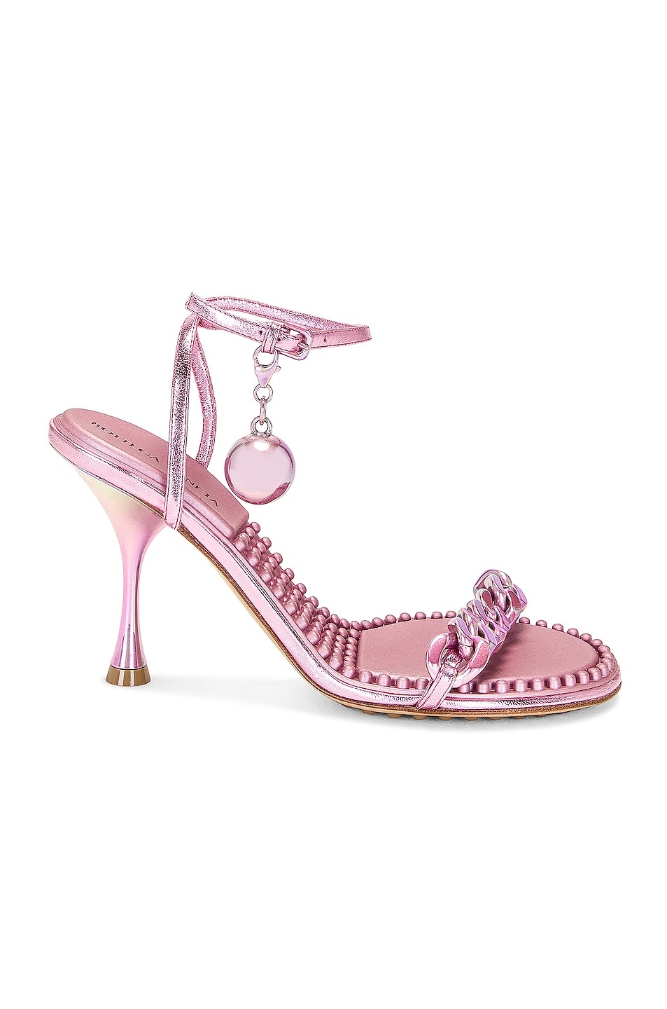 Details - Metallic lambskin leather upper with rubber-injected leather sole - Made in Italy - Ankle strap with buckle closure and detachable bauble accent - Chainlink vamp strap - Molded rubber footbed - Round toe with spool heel - Approx 89mm/ 3.5 inch heel - Our Style No. BOTT-WZ388 - Manufacturer Style No. 667178 V28O0 5963